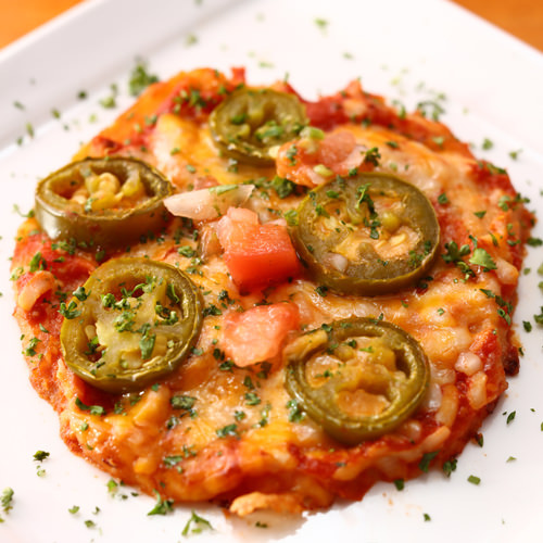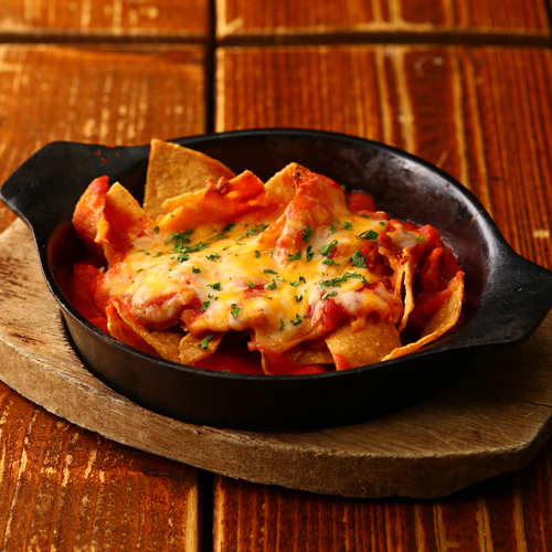 トルティーヤチップスに メキシコレッドソースとチーズをかけて焼きあげます。