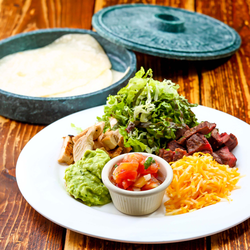 ビーフ、チキン、ワカモレ、サルサ、チーズに タップリの千切りレタスを お好みのスタイルで巻いていただく手巻きタコス。
